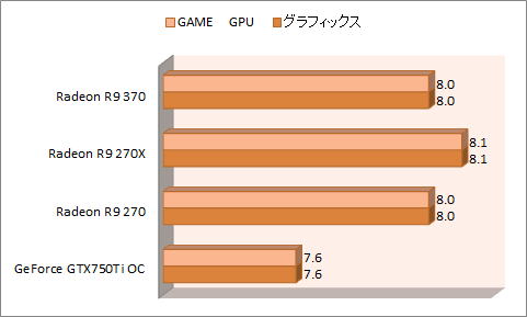 まず、エクスペリエンスインデックスではRadeon R7 370は8.0とGeForce GTX750Tiの