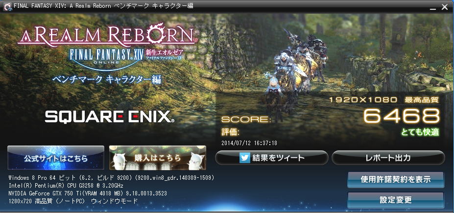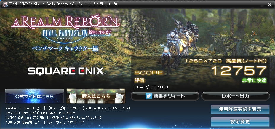 それぞれのベンチマークの結果から、Pentium G3258のオーバークロックにGeForce GTX 750Tiを取り付けることでゲームを快適にできるマシンに仕上がった。 但し、オーバークロックの設定での使用はメーカーが保証するもではありません。 また、管理人も保証はしませんので自己責任で行ってください。 →Pentium G3258とRADEON R9 270の組み合わせ 管理人お勧めのフルHDグラフィックスボードへ 「ファイナルファンタジーXIV: 新生エオルゼア プレミアムインビテーション」付き推奨パソコン