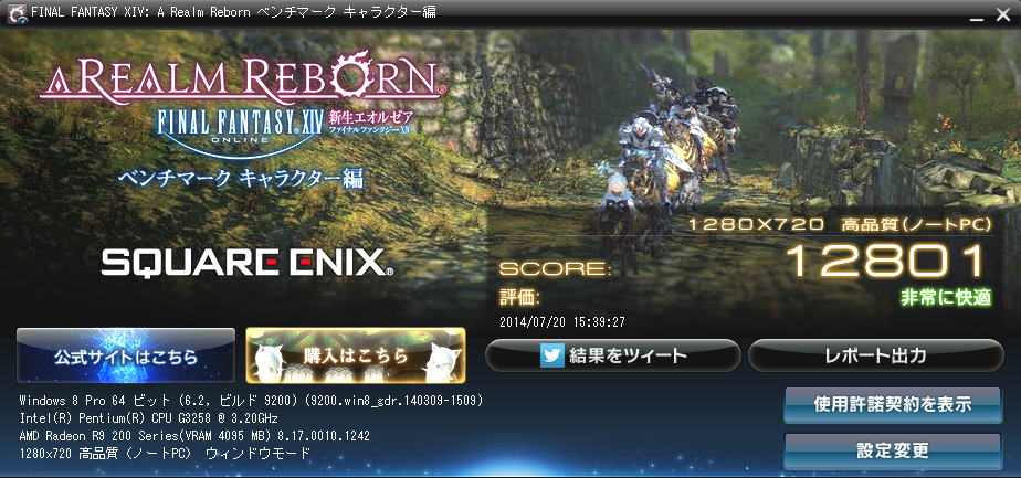 それぞれのベンチマークの結果から、Pentium G3258のオーバークロックに RADEON R9 270を取り付けることで、このボードでもゲームを快適にできる マシンに仕上がった。 但し、オーバークロックの設定での使用はメーカーが保証するもではありません。 また、管理人も保証はしませんので自己責任で行ってください。 →Pentium G3258とGeForce GTX 660の組み合わせ 管理人お勧めのフルHDグラフィックスボードへ 「ファイナルファンタジーXIV: 新生エオルゼア プレミアムインビテーション」付き推奨パソコン
