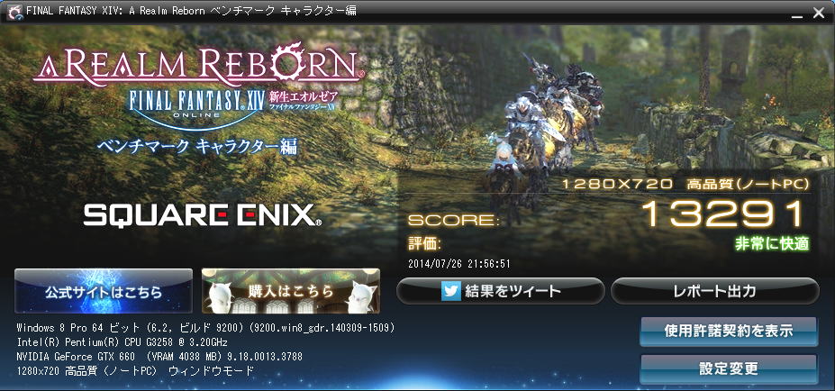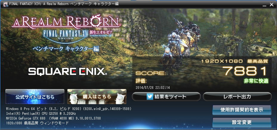 ファイナルファンタジーXIV:新生エオルゼア(新生FF14)」の初期設定ベンチマークでも グラフィックス性能差が向上して非常に快適になった。