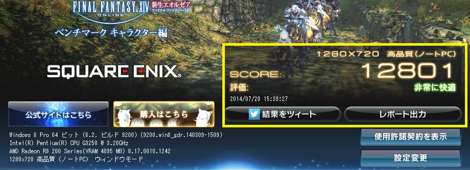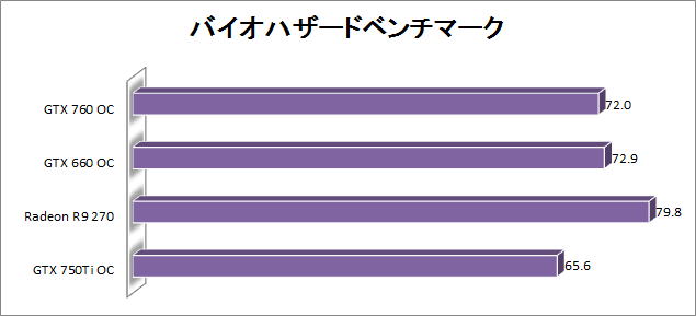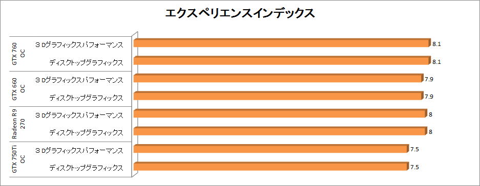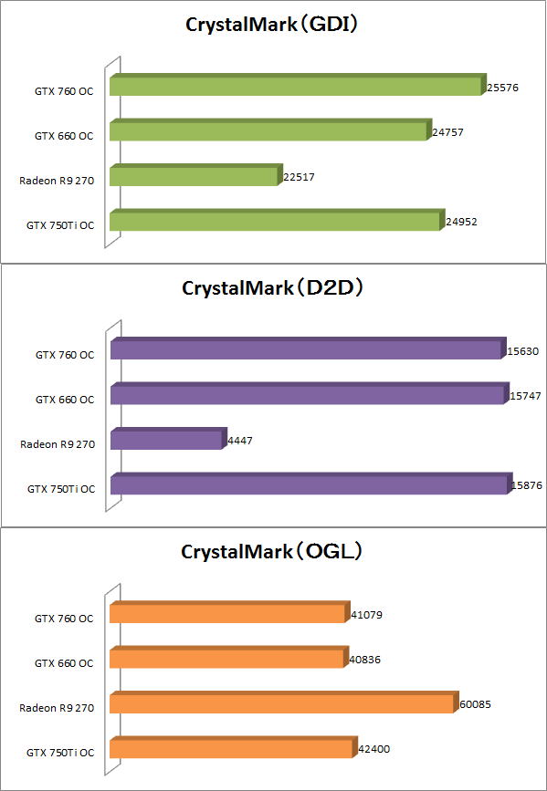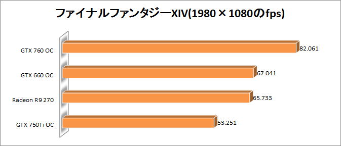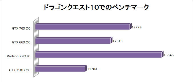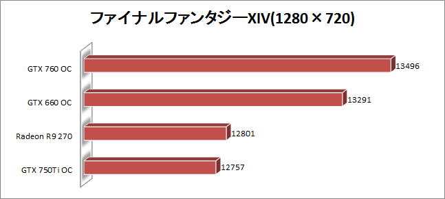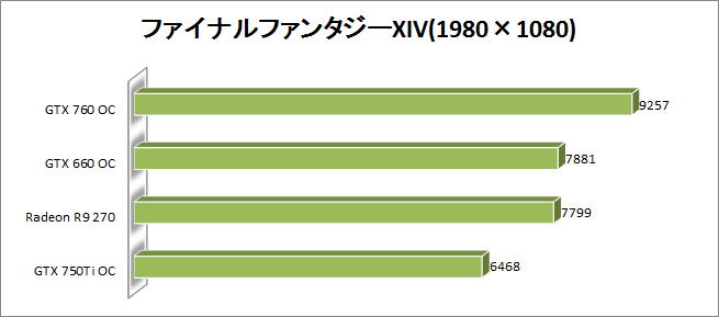 ![]() ![]() エクスペリエンスインデックスは、7.5~8.1であり各ボードとも7.0を超えており 使って見て遜色はない。 CrystalMarkの結果はグラフィクス(GDI,D2D,OGL)部分の集計です。 ![]() ![]() CrystalMarkの結果ではGDI/DirecDrawでRadeon R9 270だけが低く、OpenGLが ダントツに高い数値であった。NVIDIA製品は、おおむね同じような数値結果です。 この結果からNVIDIA製品では、値段から言ってもGTX 750Ti OCがパフォーマンスが 良いと言えるだろう。 バイオハザードベンチマークはfpsの数値を集計しました。 ![]() ![]() バイオハザードベンチマークは、各製品ともフレームレートが60fpsを超えたので 快適にプレイできると思う。 ファイナルファンタジーXIV:新生エオルゼア(新生FF14)」の初期設定ベンチマークの数値 と1920×1080のフルHDの最高品質の数値をまとめました。 ![]() ![]() ![]() ![]() ファイナルファンタジーXIVのベンチマークでは、GeForce GTX 760 OCが一番の数値 であった。 ドラゴンクエスト10でのベンチマークスコアの集計です。 ![]() ![]() ドラゴンクエスト10でのベンチマークは、Radeon R9 270が一番の数値であった。 総合結果として各製品とも一長一短であり使用するには遜色ないと思う。 決め手は購入予算であろう。 但し、オーバークロックの設定での使用はメーカーが保証するもではありません。 また、管理人も保証はしませんので自己責任で行ってください。 Intel Core i3 4330での各グラフィックボードの性能比較 管理人お勧めのフルHDグラフィックスボードへ 「ファイナルファンタジーXIV: 新生エオルゼア プレミアムインビテーション」付き推奨パソコン