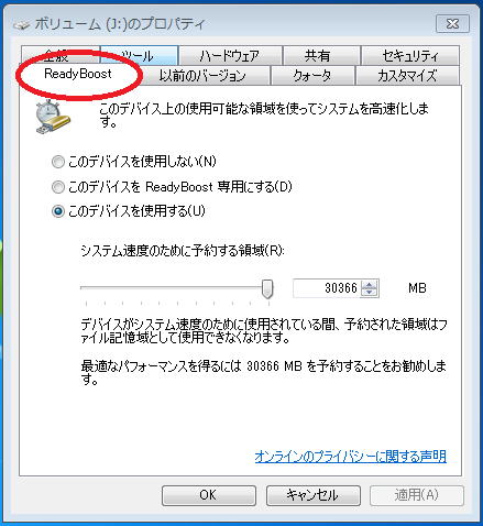 Windows7のReadyBoost キャッシュは、FAT32 ファイル システムでは 4 GB まで、NTFS ファイル