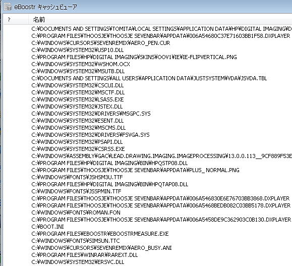 キャッシュビューアで知ることができる。基本的にはWindowsのDLLファイル、EXEファイルなどがコピーされて