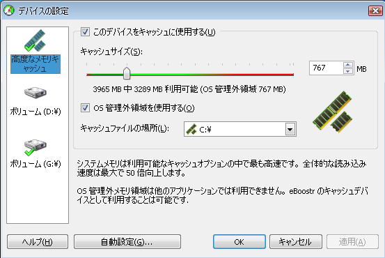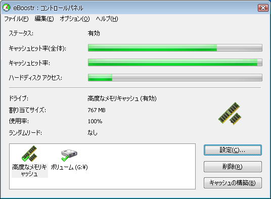eBoostrはWindowsXpでUSBメモリなどでキャッシュを構成し高速化できるソフト、こいつを使ってSSDをキャッシュに