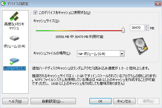 開いたら設定ボタンをクリックしSSDとメモリをキャッシュに設定する。