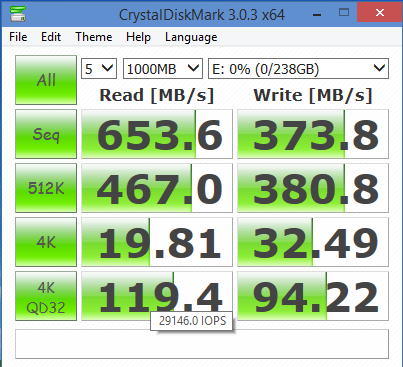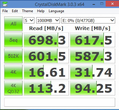購入して箱の裏面にRaid0の公称値で625MB/sと載っていた。 OSをインストール後、実際にCrystalDiskMarkを計測してみた。
