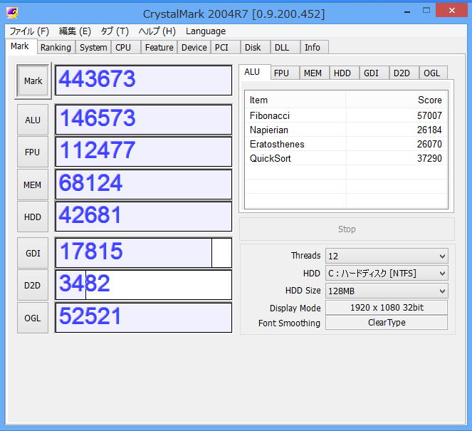 BISOSを更新してベンチマークが安定したので、CrystalMarkのベンチマークとCINEBENCH