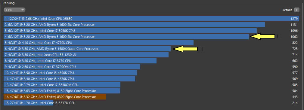 結果から、Ryzen 5 1600がトップでRyzen 5 1500Xが追随するデータになった。